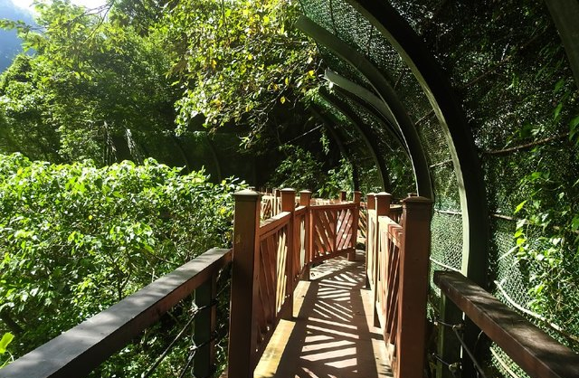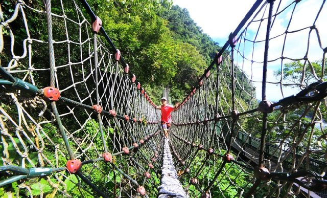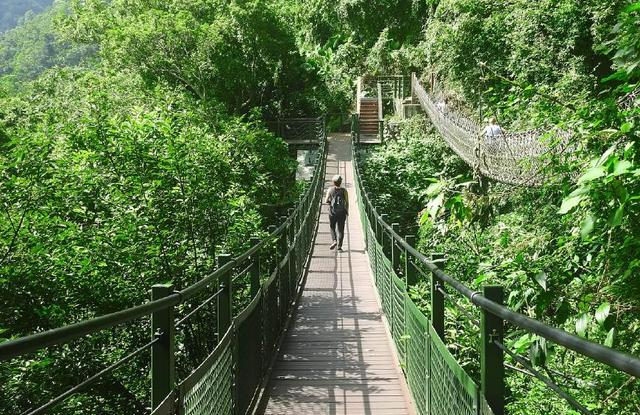 沿砂卡礑步道贴立雾溪前行几公里,会见到两座平行吊挢,危险摇晃的滕笼吊桥为当地原住民太鲁阁人通行所用,平坦稳定的木板吊桥供游客使用。