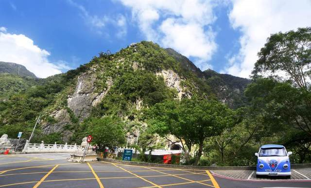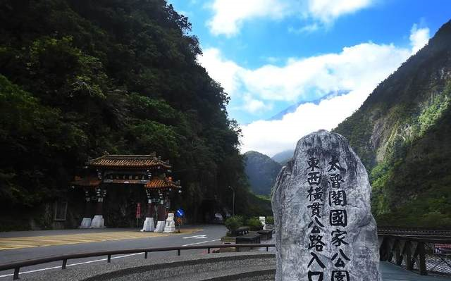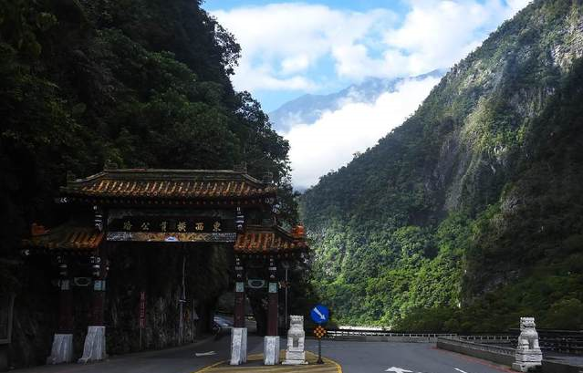 继续前行便来到太鲁阁国家公园入口,太鲁阁是台湾东西走向打通的中横公路最重要的一个节点,东起台中,西至花莲,入口有一红柱金瓦的仿古牌坊,上书:东西横贯公路。